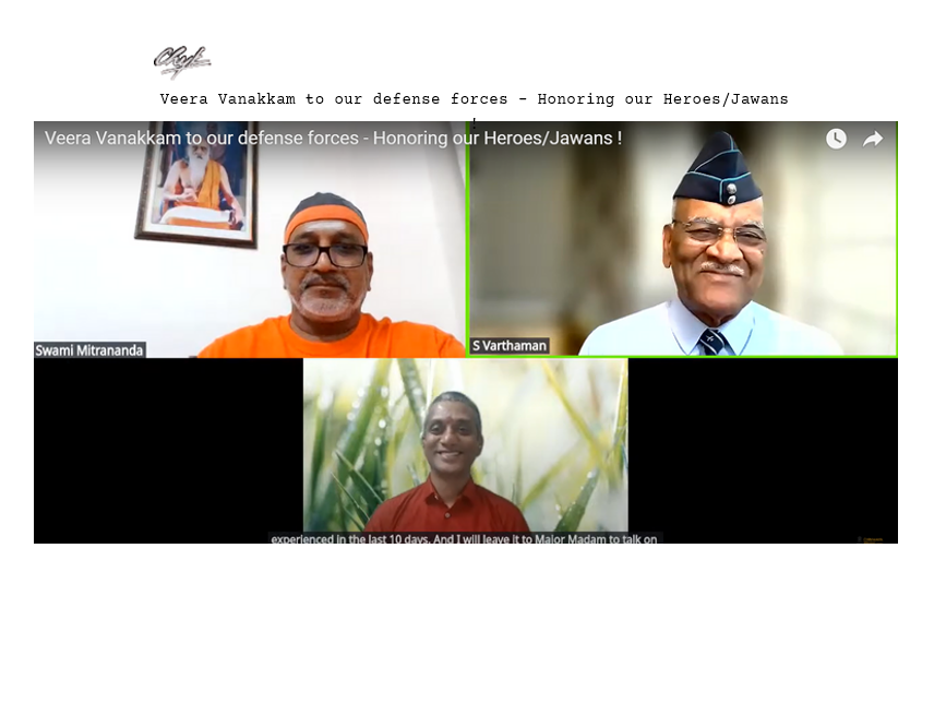 On May 18th, an online session by Chinmaya Mission was held to appreciate and express deepest gratitude to our defense personnel and martyrs for strategically attacking the terrorists and avenging the attack on 26 innocent lives. Titled ‘Veera Vanakkam,’ the meeting was headed by Swami Mitranandaji to make the worldwide audience know ‘What happened?’ and ‘How it happened?’ Air Marshal Shri Varthaman and Major Shri Madhan Kumar were the eminent speakers, while the entire Chinmaya family, which included parents, students, and staff, listened attentively. Hearing about India’s strength from defense personnel filled our hearts with pride and patriotism for the nation.